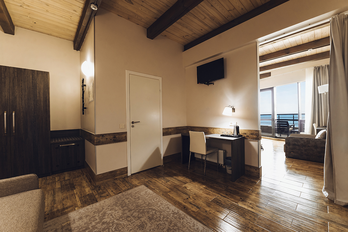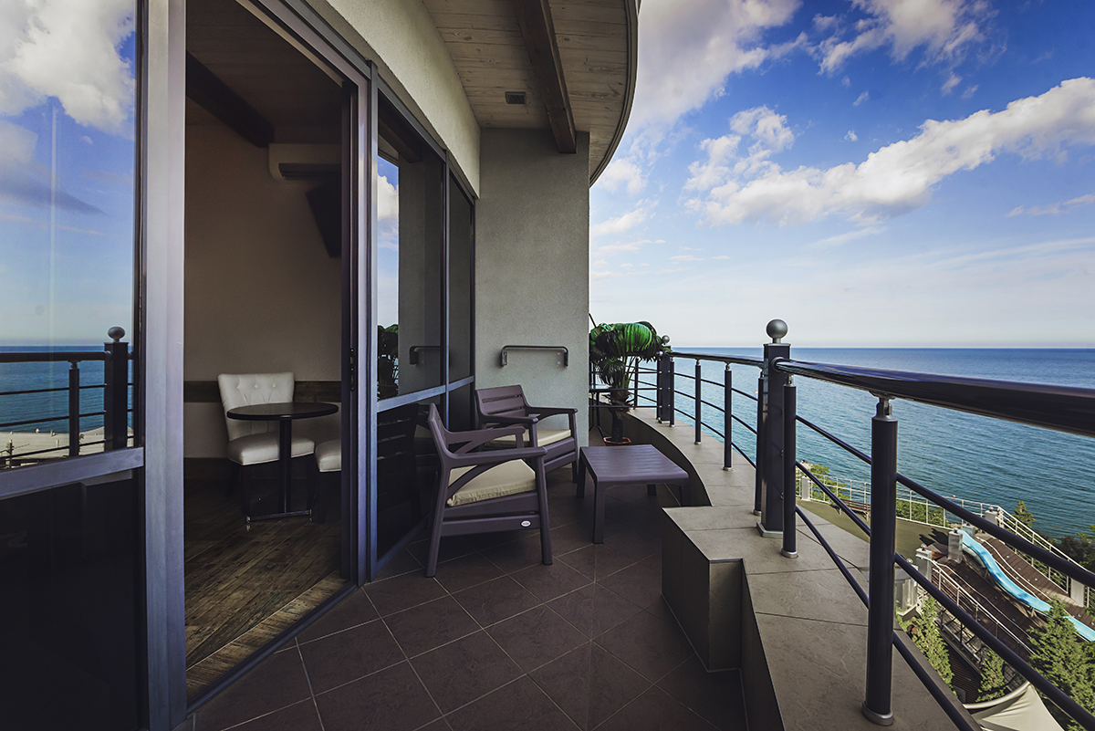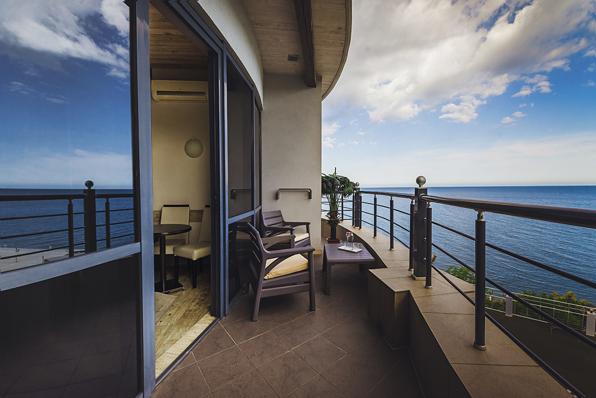 Номера 35 — 43 м.кв. Двухкомнатные с проходной комнатой и однокомнатные.Балкон 7-9 м.кв. С великолепным видом на море и шезлонгом. Двухспальная кровать , большой диван или кресло.