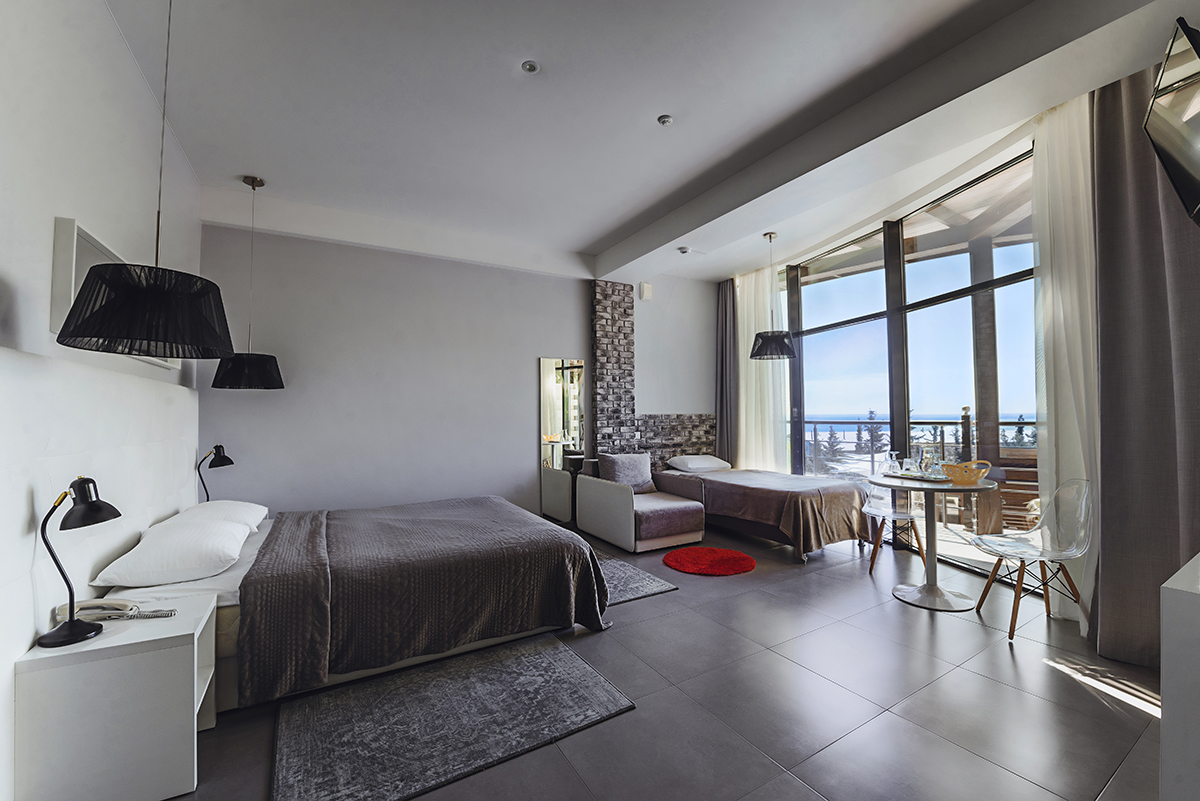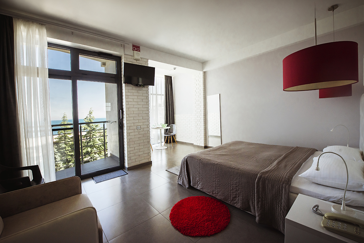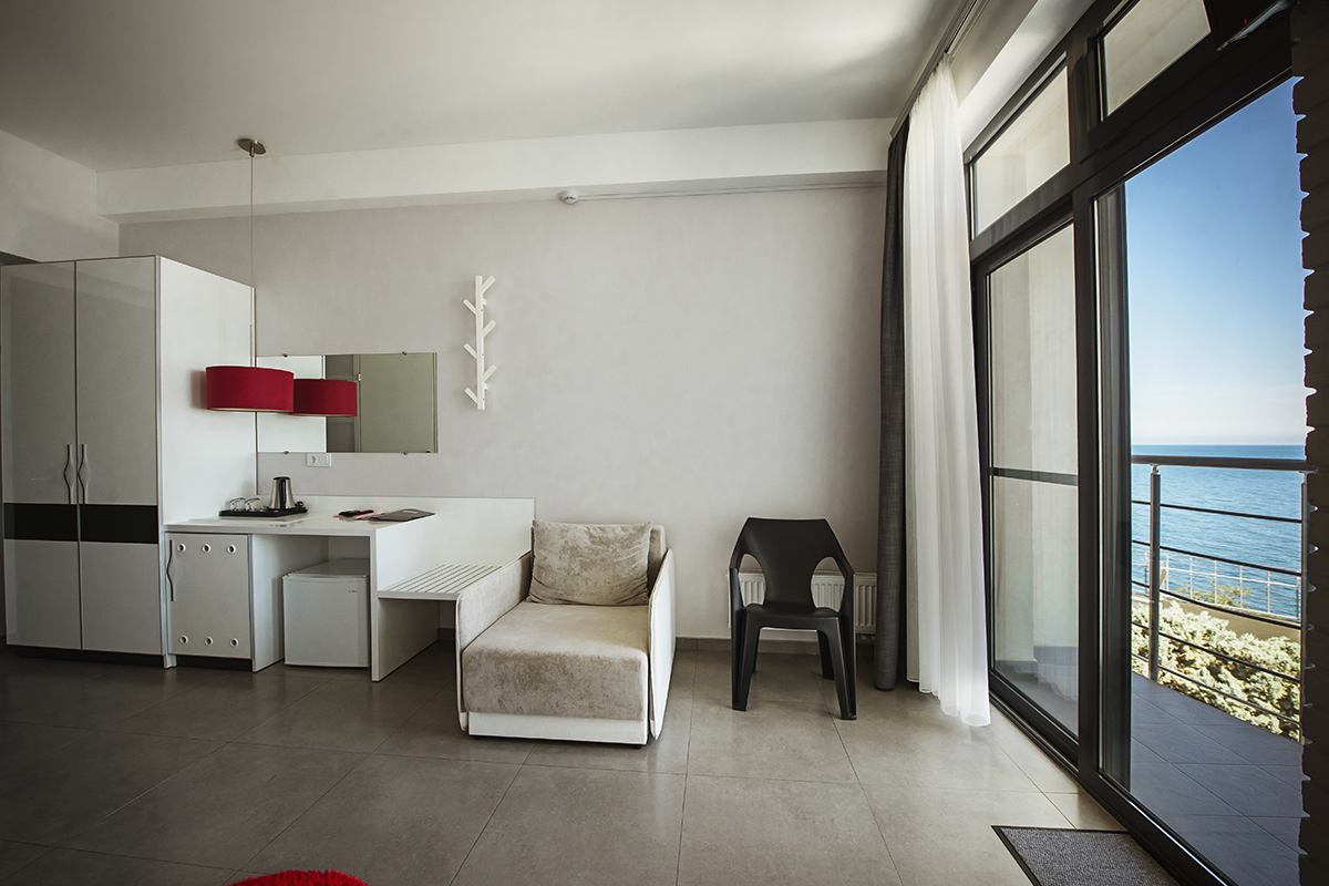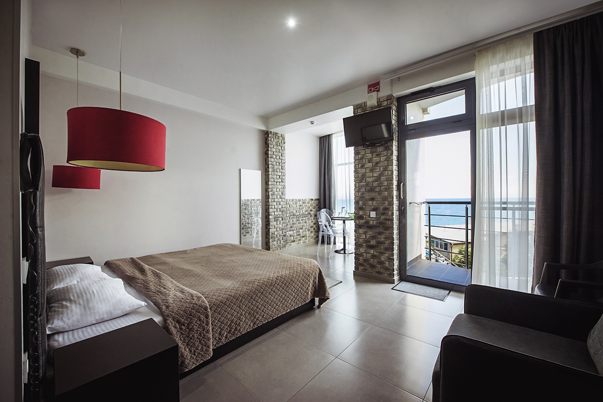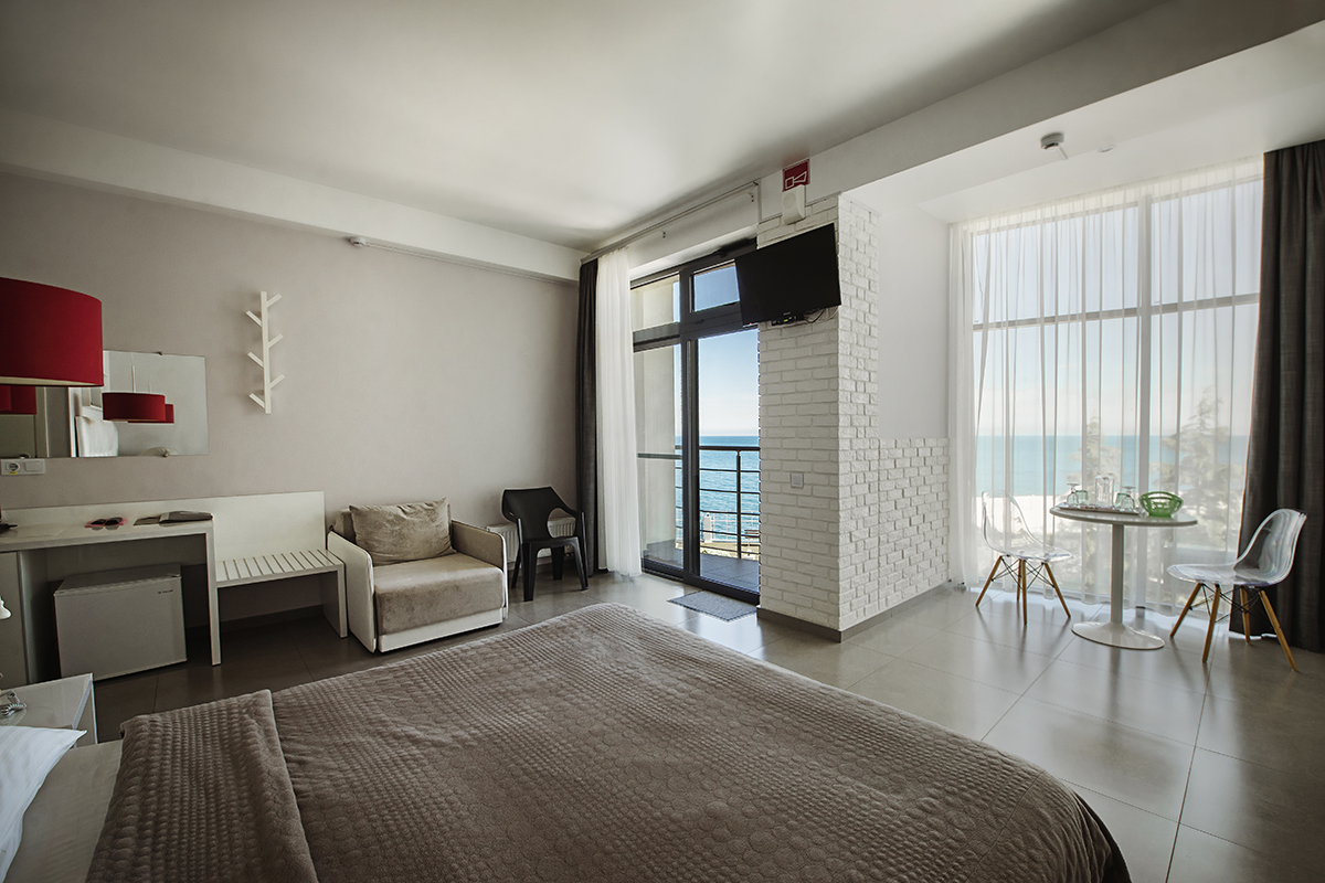 Номера 25 - 27м.кв. с балконом и видом на море. Двухспальная кровать и раскладное кресло.