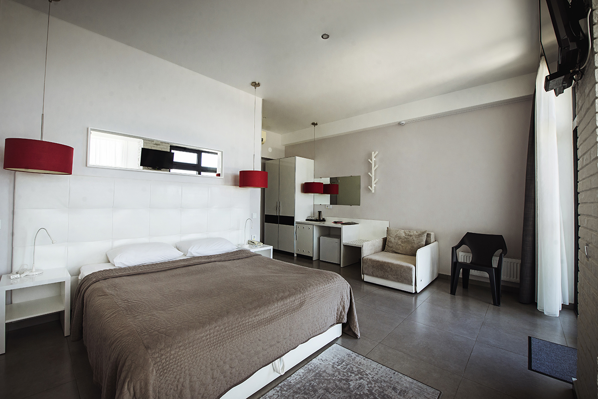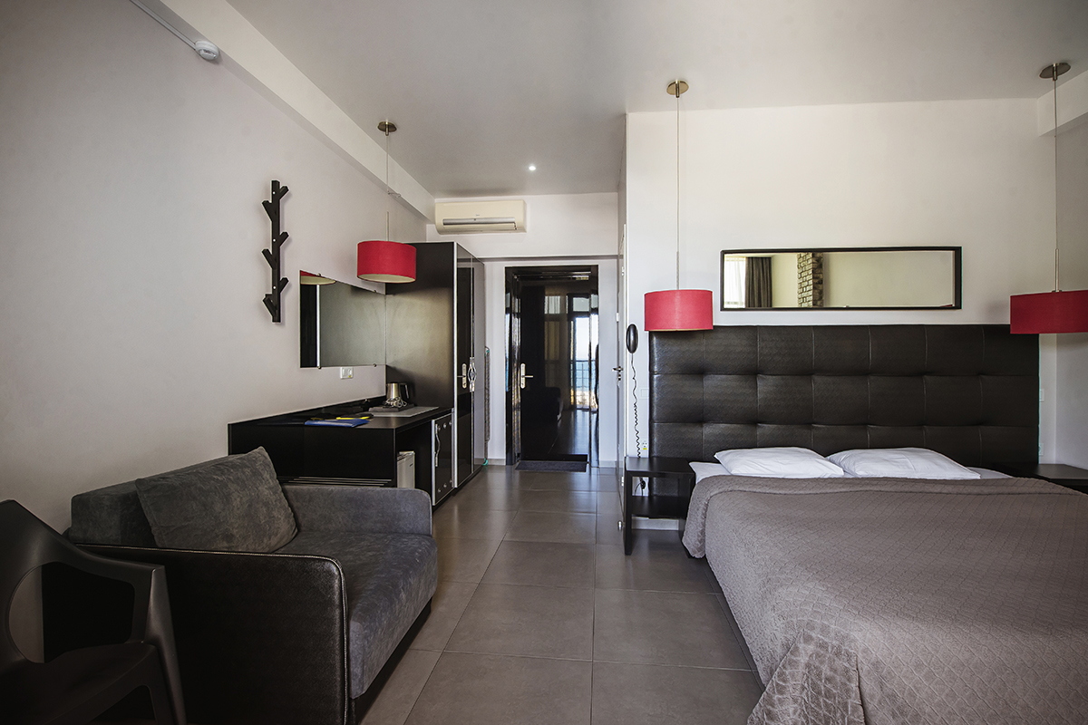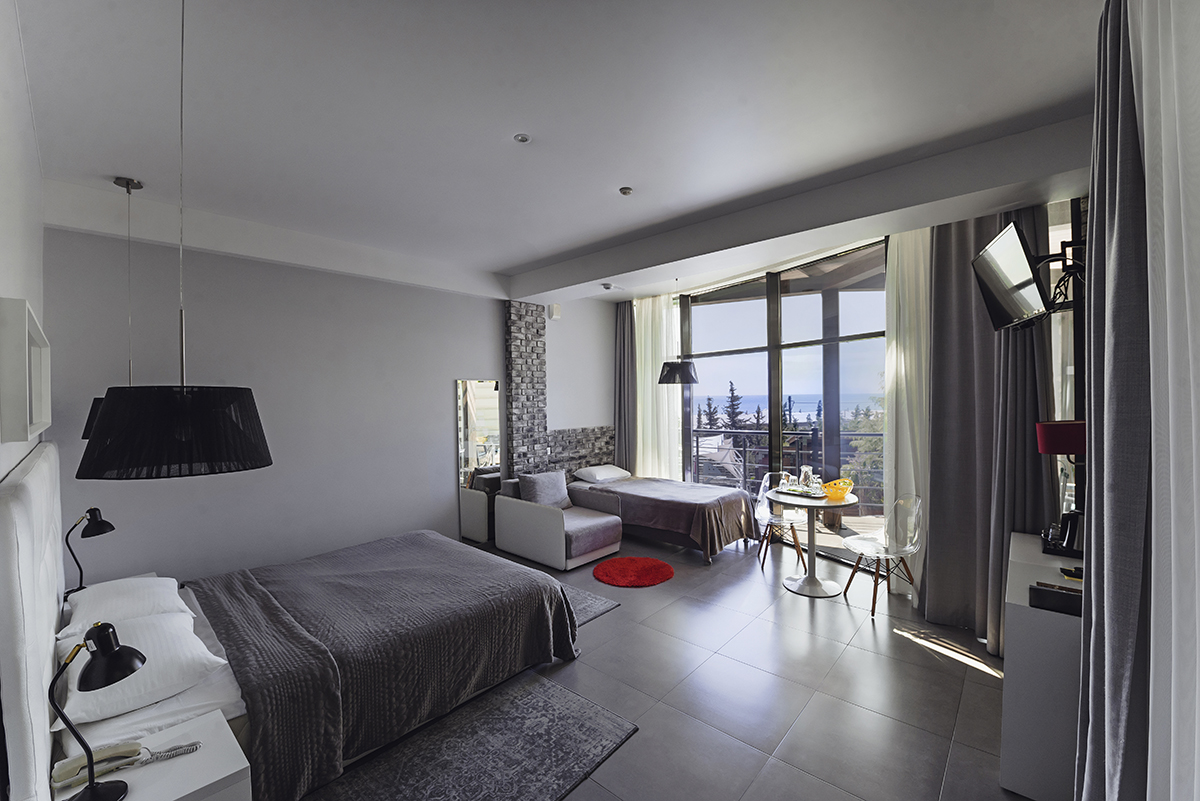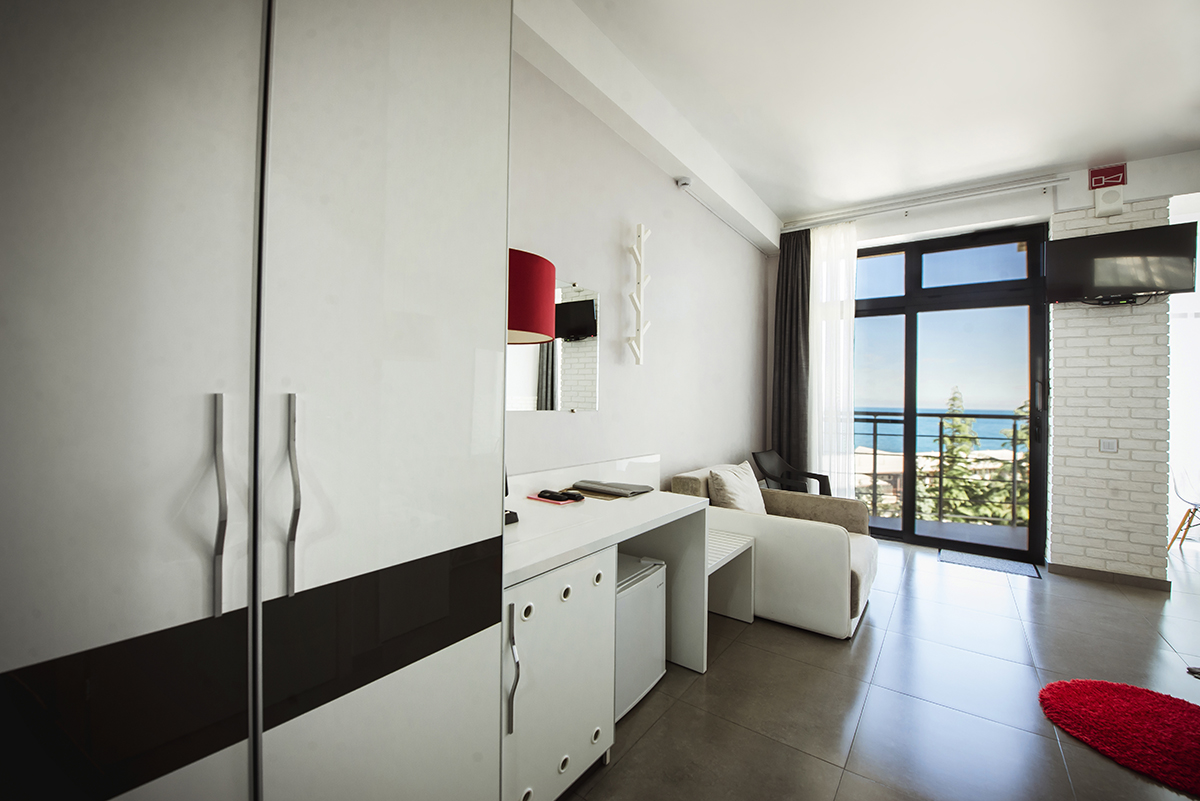 Номера 25 - 27м.кв. с балконом и видом на море. Двухспальная кровать и раскладное кресло.
