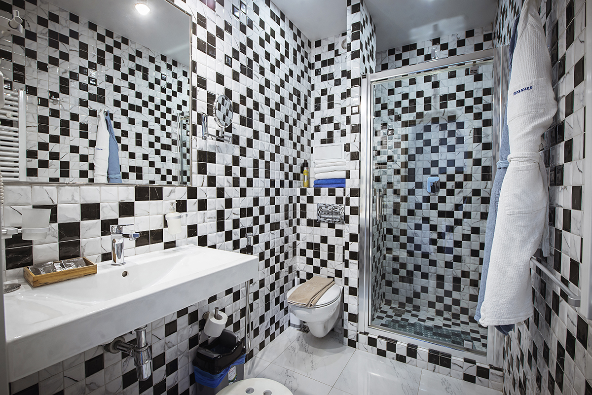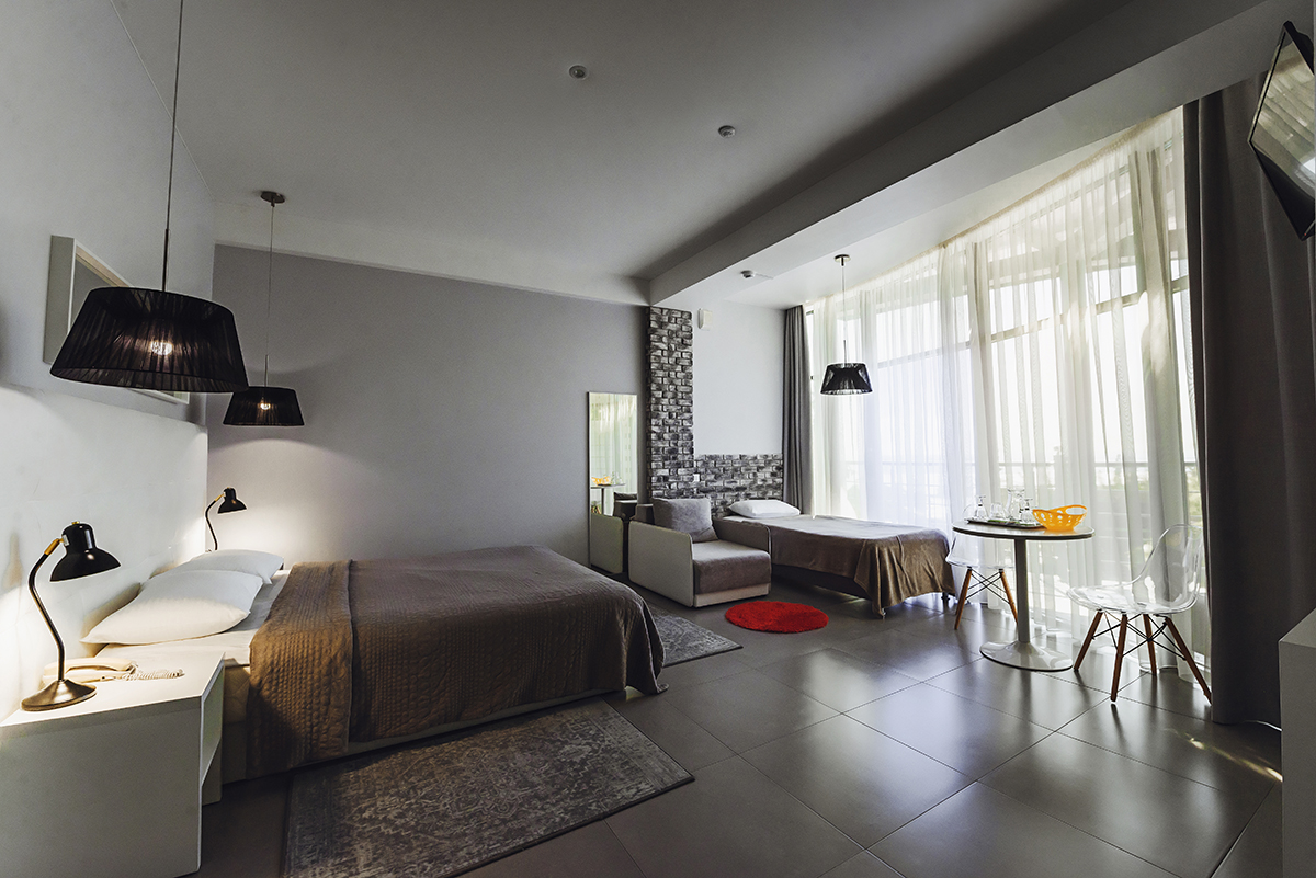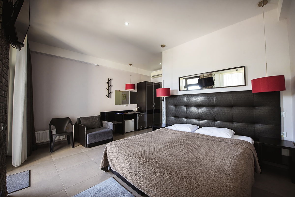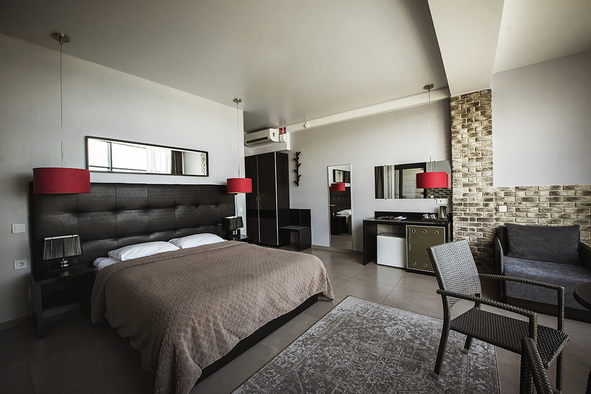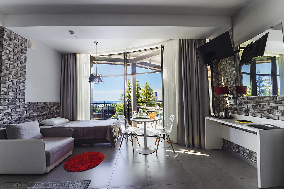 Номера 25 - 27м.кв. с балконом и видом на море. Двухспальная кровать и раскладное кресло.