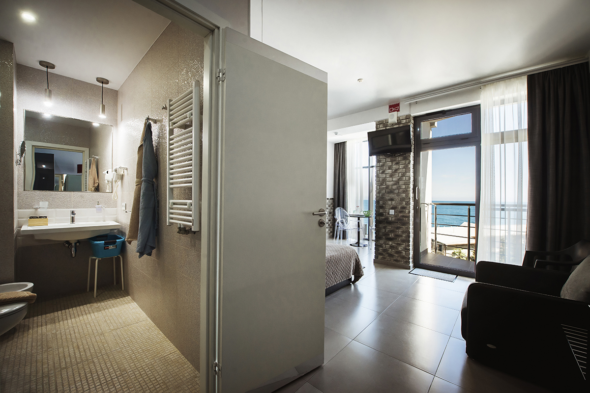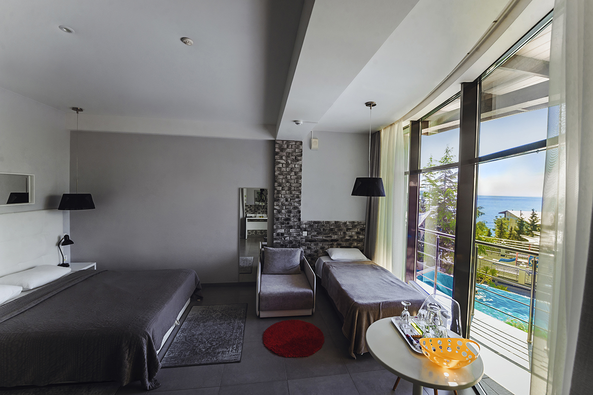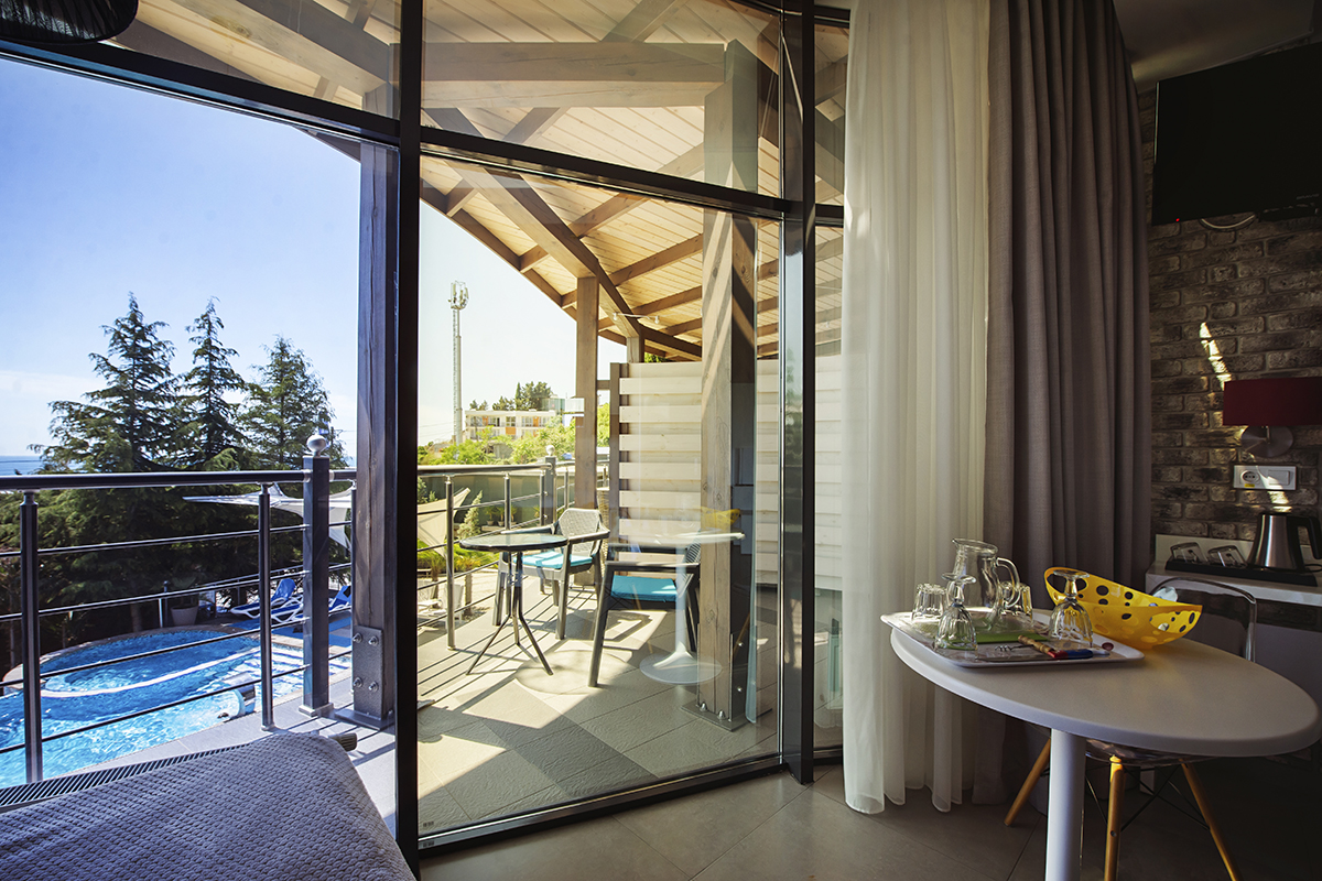 Все номера данной категории гостиницы Алушты с бассейном открываются индивидуальной картой-ключом. Из окон открывается вид на море.