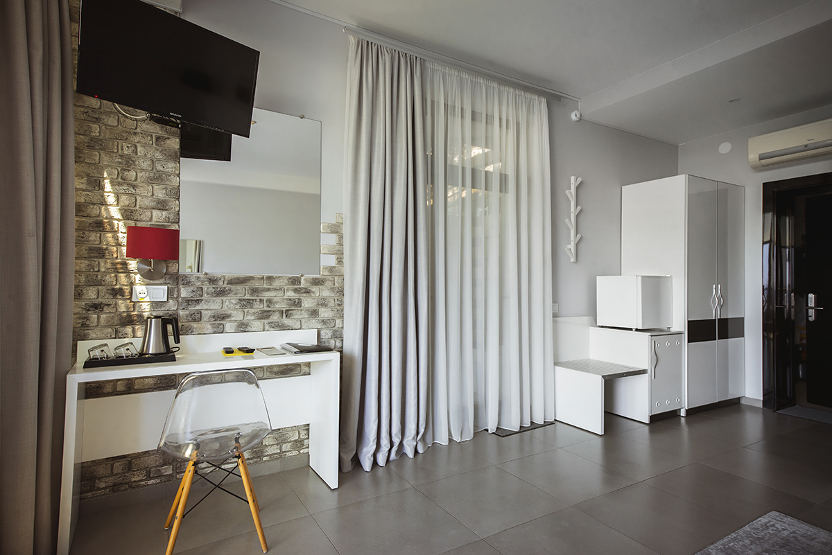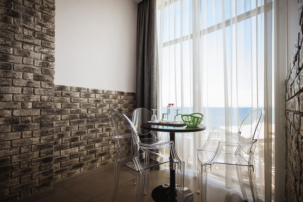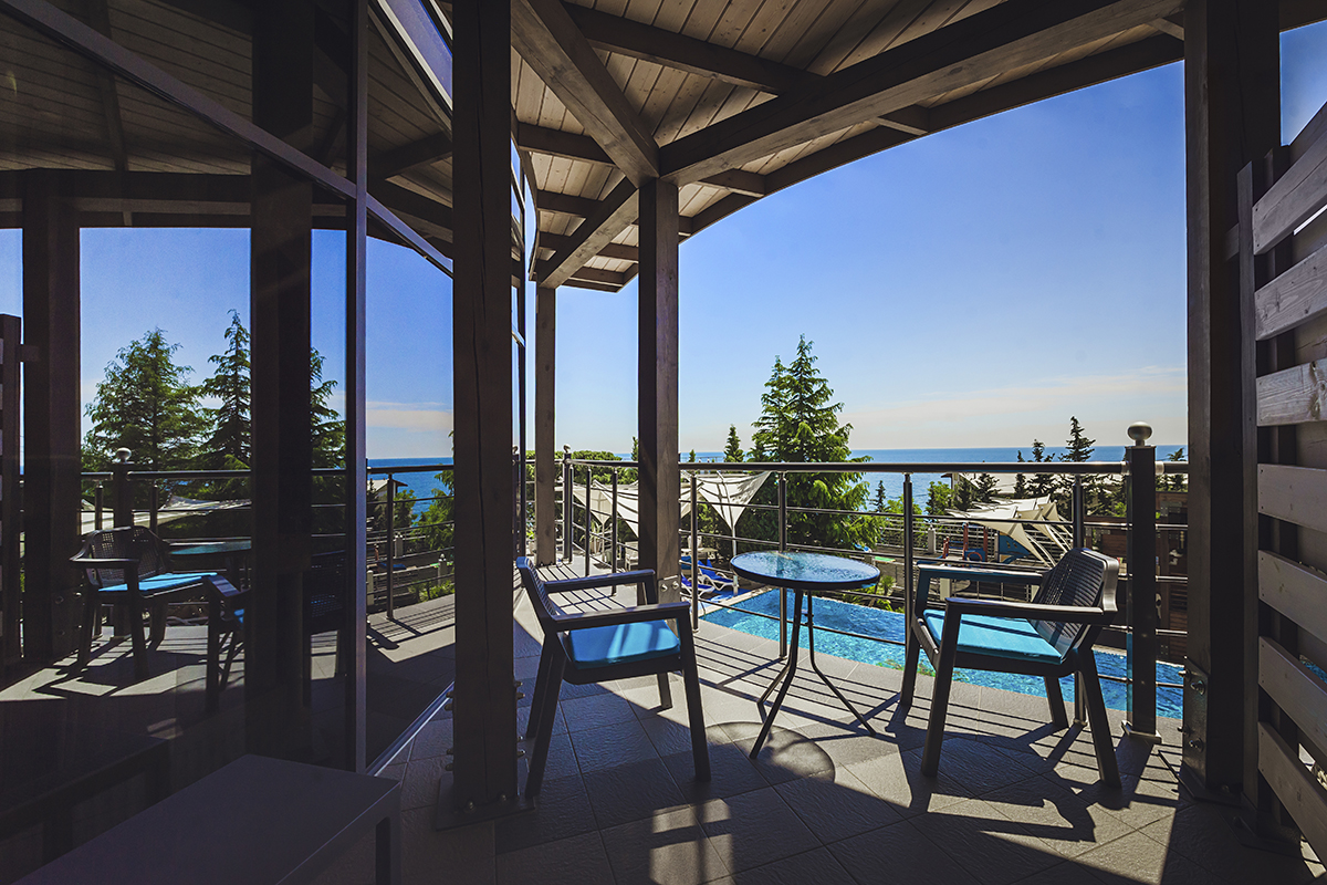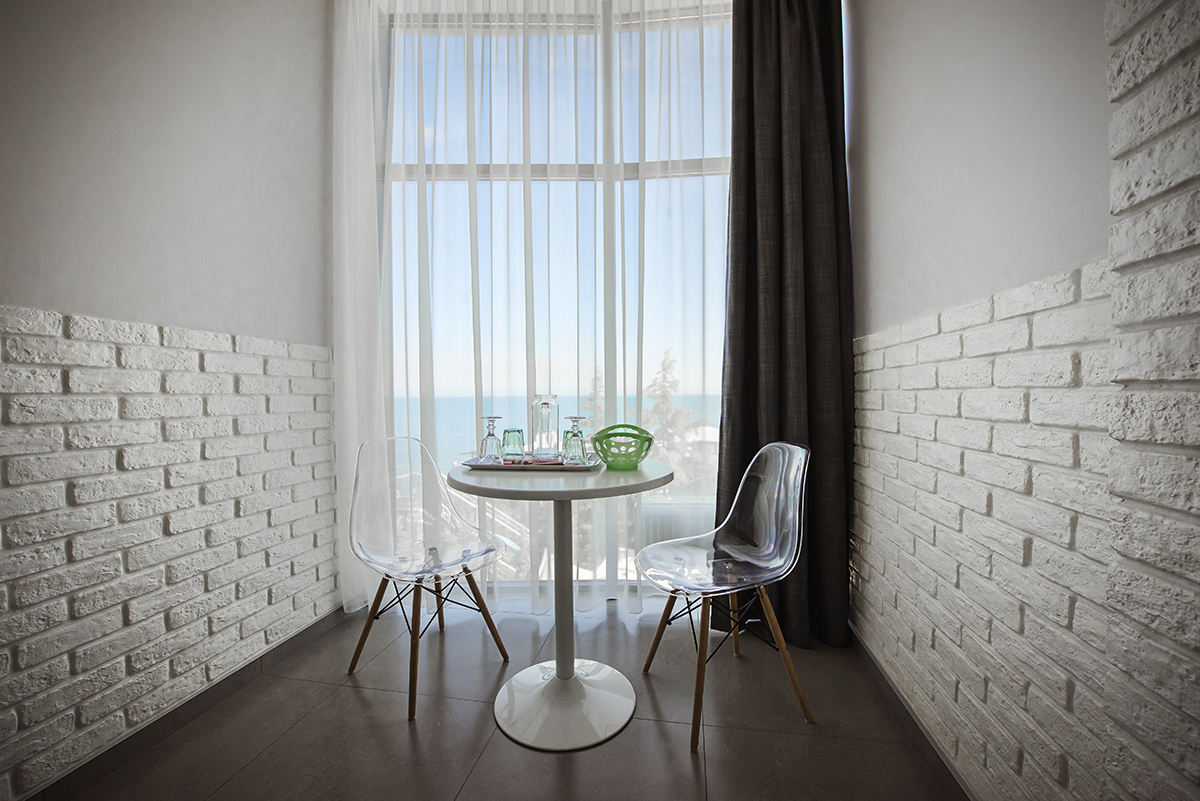 Все номера данной категории гостиницы Алушты с бассейном открываются индивидуальной картой-ключом. Из окон открывается вид на море.